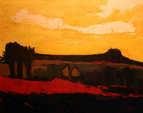 Landschap in rood en geel, olieverf op doek circa 80 x 100 cm