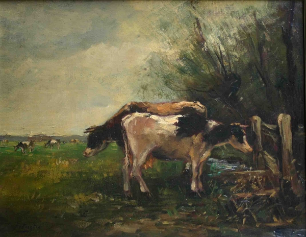 Koeien in hollands landschap; olieverf op paneel circa 75 x 59 cm