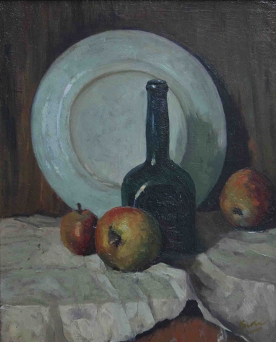 Stilleven, fles met appels, olieverf op paneel circa 35 x 45 cm